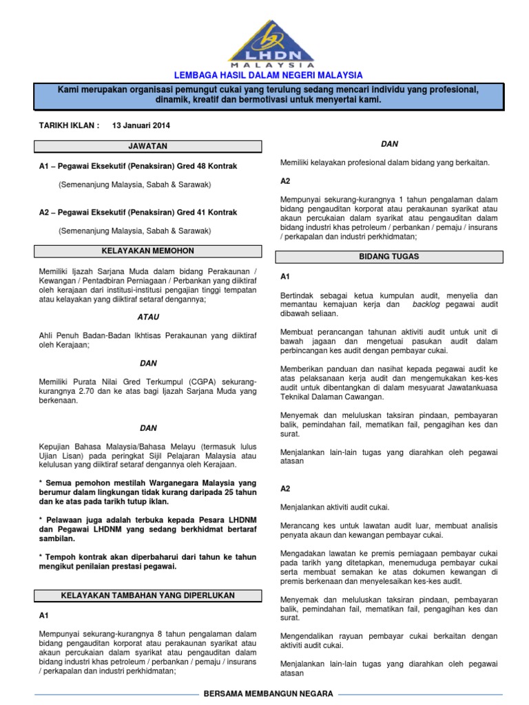 PEGAWAI EKSEKUTIF KEJURUTERAAN GRED 41 2. Page ini TIADA kaitan dengan pihak Suruhanjaya Perkhidmatan Awam SPA mahupun Lembaga Hasil Dalam Negeri Malaysia. SOALAN SOALAN LAZIM PERMOHONAN JAWATAN DI LEMBAGA HASIL DALAM NEGERI MALAYSIA LHDNM 1.
